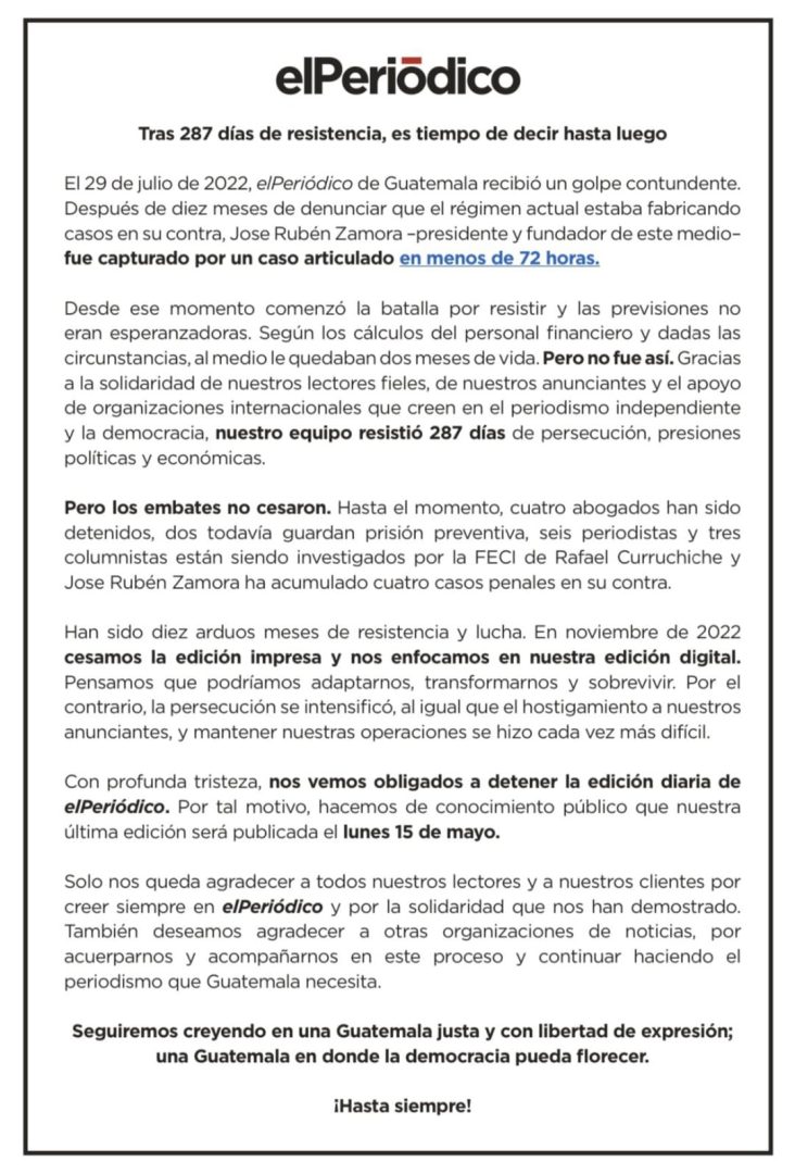 El Centro PEN Uruguay comparte a socios, amigos y lectores el siguiente comunicado del medio impreso «ElPeriódico» de Guatemala para hacer de conocimiento público que su última edición será publicada el lunes 15 de mayo.